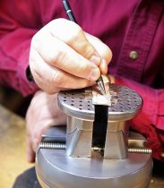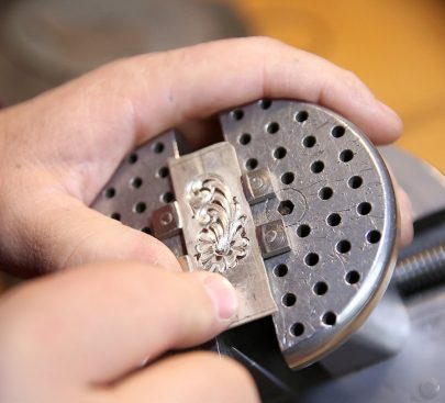 Starting with sheets of silver and die molds of his own creation, Hardy’s silver creations take shape. Gold ingots are melted down to create small bars of 18, 14 or 10 karat gold which are rolled out into sheets to be cut and soldered in place. A myriad of small tools allow Hardy to carve intricate owers, leaves and scrolls.
