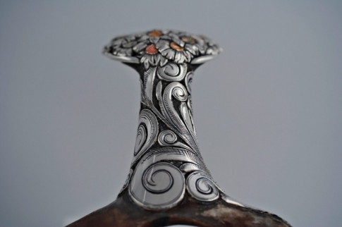 Scott decided to be the best that he could be. He studied art and composition, and various styles of engraving. He studied companies like Tiffany, and a lot of great silver companies that never expanded into western products. He studied more modern companies that did, and found that they used “western” as an excuse to be crude. This never sat well with Scott because he found that high quality silver had been an integral part of the West. For example, the King Ranch had been decorated by Tiffany and Co. Many of the ranches in Alberta were founded by European nobleman who brought with them an appreciation of silver. Scott remembered holding his great grandmother’s silver tea service, with the incredible workmanship, which she’d brought over from England. He continued to learn on his own, and Chuck Stormes continued to critique his work.