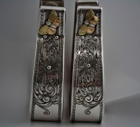 Scott’s saddle silver has become fun for him because he collaborates with the saddle makers to make his silver tie in with their designs. He also feels that a fine saddle is a sculpture, and should be seen as such. He likes making silver gullet covers which he forms on the saddle tree itself. Scott’s 1 1/2 inch solid sterling silver engraved conchos start at $135.00 each. He uses heavy 16 gauge solid sterling for his saddle conchos. For other saddle silver he uses 14 gauge. He feels that if a horse rubs on it, it won’t dent or bend and can be polished out. Scott uses 14 and 18 carat gold for trim as well. The 14 carat is used on men’s buckles as well because it stands up the best. The 18 carat has a brighter, contrasting, color. The closer you get to pure or 24 carat gold, the softer the metal is. Figures are cut out by hand, and then hand sculpted.